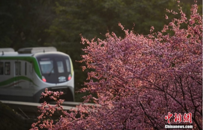 2月26日,重庆,游客打卡“开往春天的列车”。随着天气转暖,重庆轨道交通2号线佛图关段大面积美人梅竞相绽放,单轨列车穿行在“花海”中,被网友们称为重庆版“开往春天的列车”,吸引众多民众前来观赏打卡。