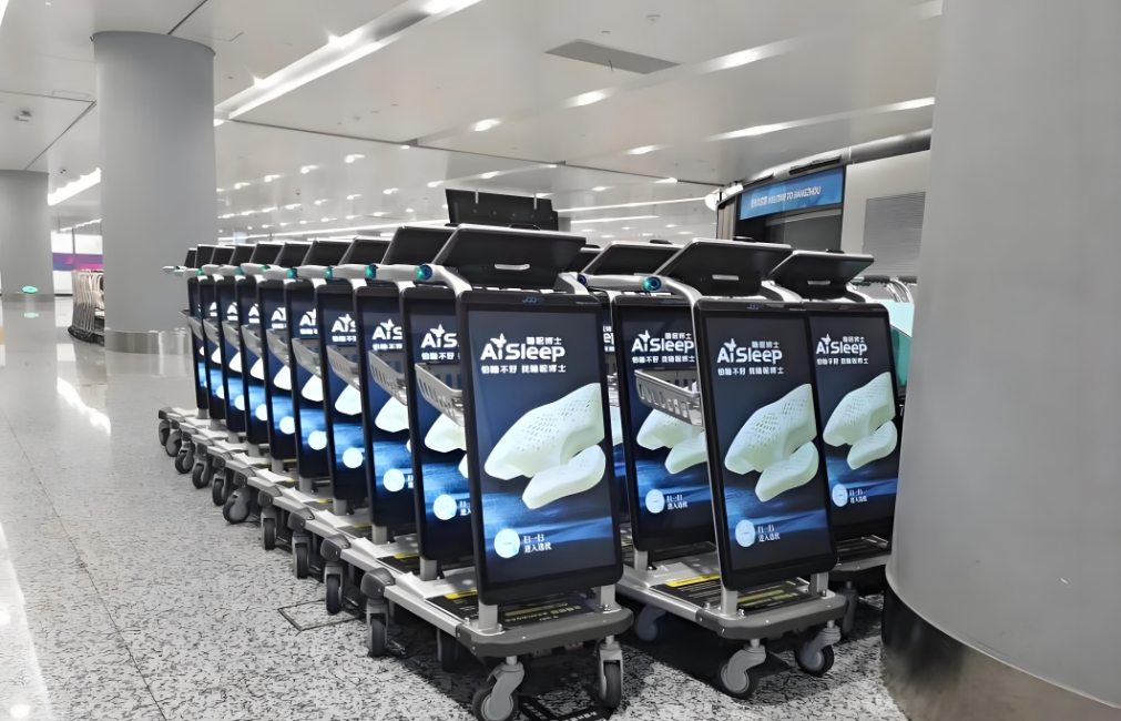 重庆江北国际机场日均客流量庞大,旅客在值机、候机、行李提取等环节中,手推车成为不可或缺的“移动伴侣”。据统计,旅客平均停留时间超过90分钟,手推车广告通过车身与电子屏双媒介组合,实现高频次、多场景的曝光。例如,重庆机场曾引入7000台航天品质手推车,其耐用性和功能性通过严格测试,广告屏更以“顶天立地”的视觉设计占据旅客动线核心位置。