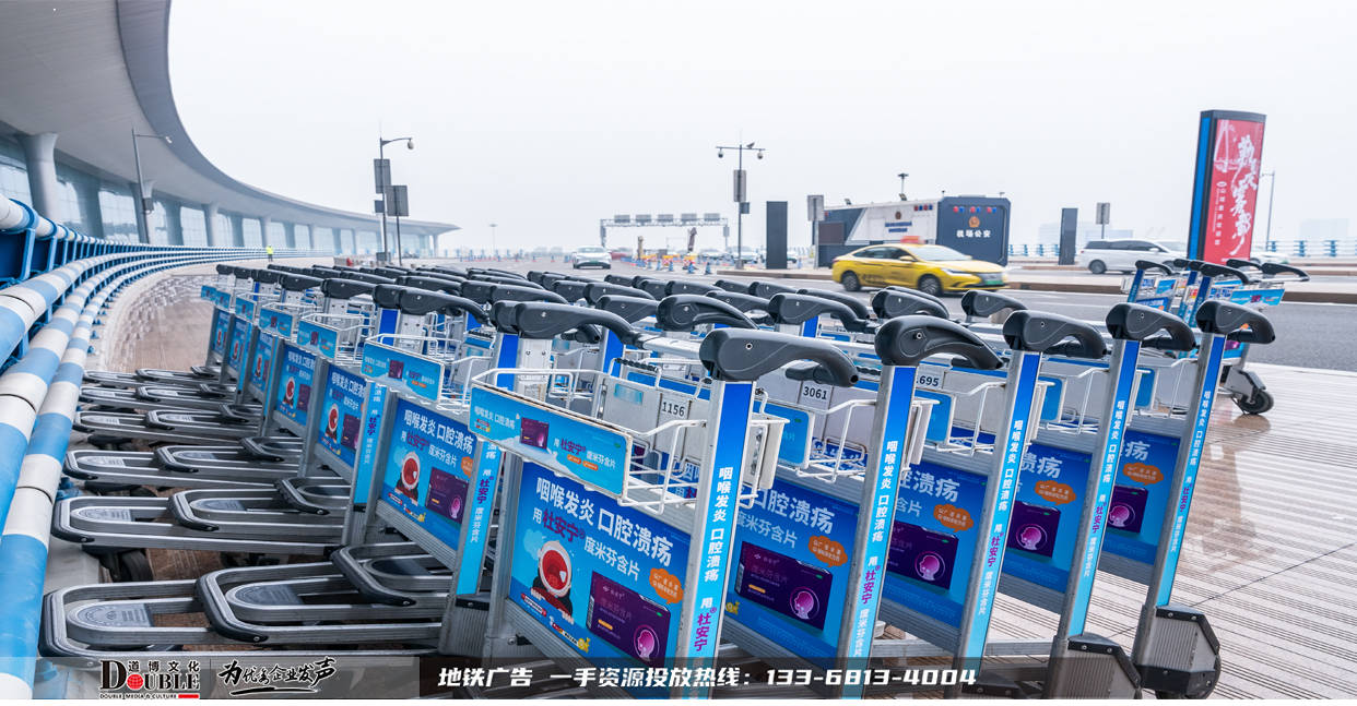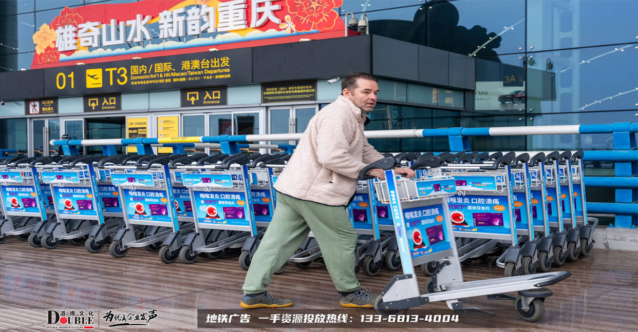 作为中国西部重要的航空枢纽,重庆江北国际机场年旅客吞吐量已突破5000万+人次,汇聚了大量商务、旅游及中转客流。在这样一个高流量、高价值的传播场景中,机场手推车凭借其独特的流动性与高频曝光率,已成为机场内最醒目的“移动媒体”之一。手推车广告遍布于机场国内及国际出发、到达通道、行李提取区、停车场等核心动线,100%覆盖所有进出渝旅客,是品牌实现高效曝光的理想载体。