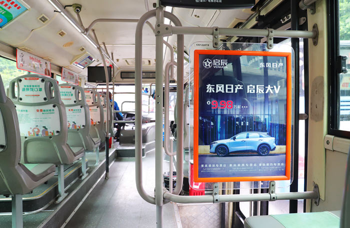 公交车内彩旗广告和灯箱广告位于座椅上方。广告的表达形式是以图片和文字的形式进行的。一般来说,它与成年人的眼睛大致平行,这便于广告的展示。免费乘客可以非常详细地访问所有广告,这为广告传播提供了机会。这也是公交广告的必要场所,灯箱广告通电后,晚上也能显示,展现时长更高。