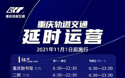 11月1日起,重庆轨道交通运营时间启动常态化延时,工作日大多数线路末班车发车时间延迟至23:00,与节假日保持一致。