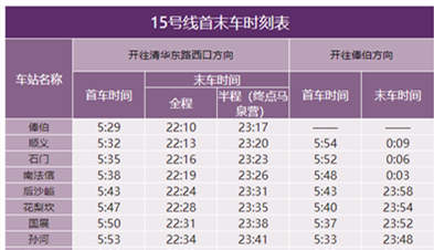北京地铁15号线是北京市第十条建成运营的地铁线路,标志色为紫罗兰。北京地铁15号线运营时间 (俸伯 5:30-22:11 | 清华东路西口 5:42-23:15)
