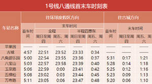 北京地铁1号线作为中国建设的第一条城市地铁线路,于1969年10月1日开始试运营,其标志色为红色 ,地铁1号线首尾班车经过各车站时间 (苹果园 5:10-22:55 | 四惠东 5:05-23:15)