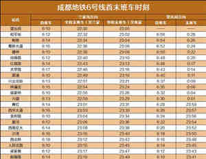 成都地铁6号线为四川省成都市第九条开通运营的地铁线路,标志色为棕色。全长68.76千米,共设56座车站,首尾班车经过各车站时间 (望丛祠 6:10-22:30 | 兰家沟 6:10-22:30)