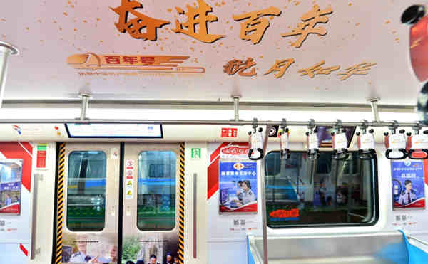 主题列车以沉浸式融媒情景体验为特色,充分发挥地铁客流量大、辐射范围广、贴近群众日常出行的优势深受广告主的青睐,2021年是中国共产党百年华诞,成都推出了百年号”强国主题列车.